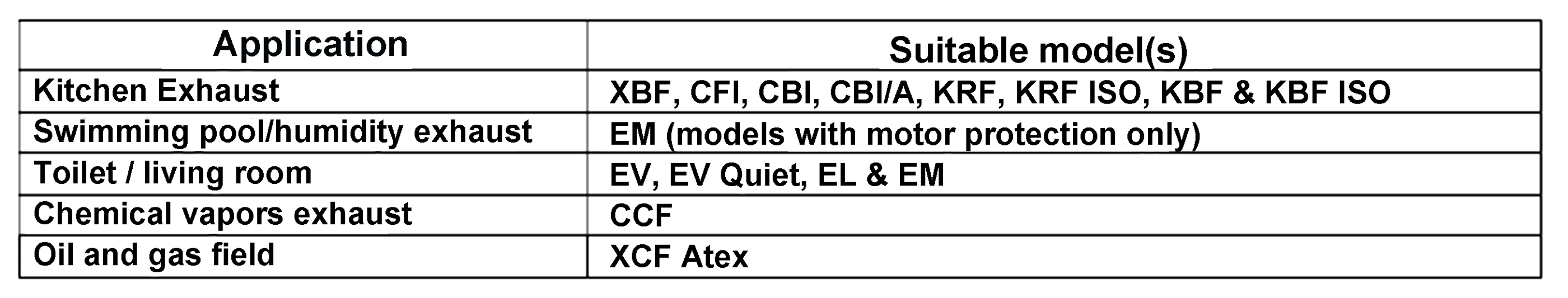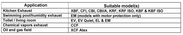 The schedule is an example for the most common applications for any special application please don’t hesitate to ask for our advice for the fan selection